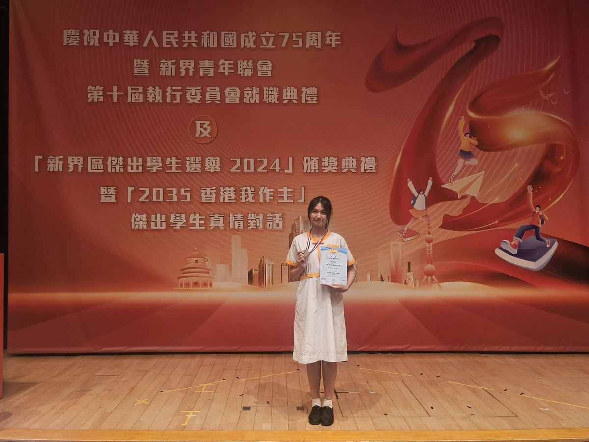 本校6D鄭嘉詠同學參加由新界青年聯會、新界青聯發展基金會、香港傑出學生會舉辦「新界區傑出學生選舉2024」,獲得「短片創作高中組第一名」 及「新界區優秀學生」殊榮。