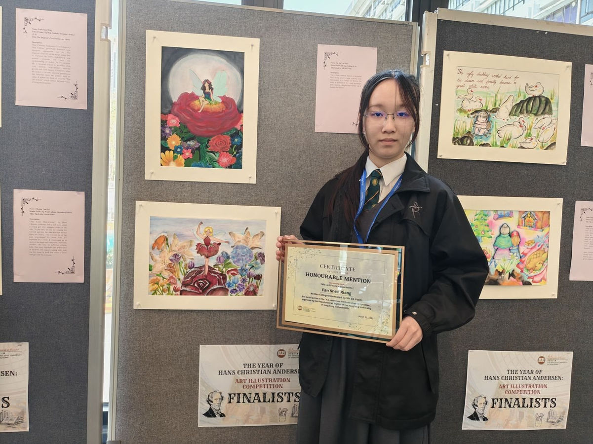 為紀念安徒生逝世150週年,恒生大學人文社會科學學院舉辦了插畫比賽。本校冼家恩榮獲季軍及范沉香榮獲優異獎。