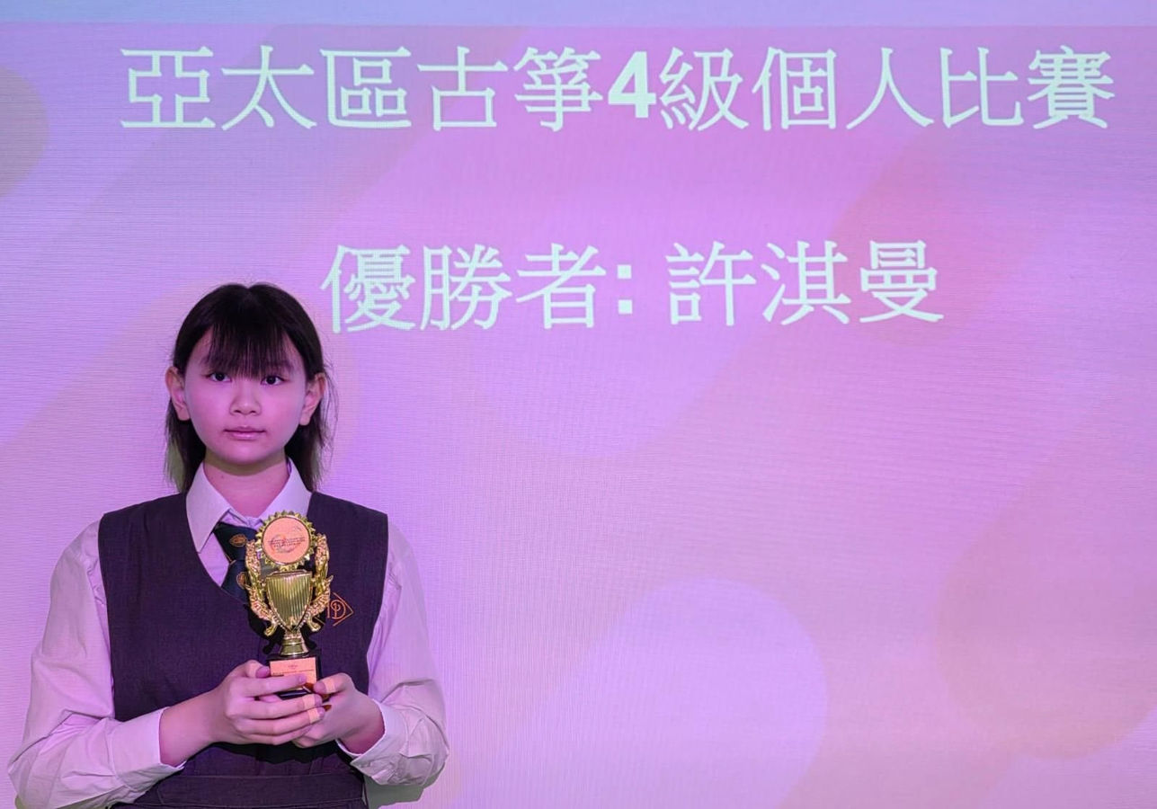 3B許淇曼同學早前參與了由亞太區全優兒童創藝協會舉辦的亞太區古筝4級個人比賽。是次比賽讓許同學展現了其出色的音樂才華,並進一步提升了演奏技巧,為個人音樂發展邁出重要一步。謹此表揚許同學的努力與表現!