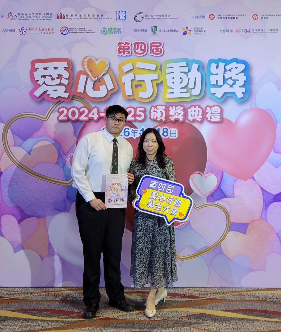 6C歐竣熙同學及6D吳愷瑤同學於第四屆「愛心行動獎 2024-2025」中榮獲嘉許狀,以表揚他們在義務工作中的積極參與、對社區的關注以及對他人的關愛。他們以實際行動展現了無私奉獻的精神,為社區帶來了正能量。該獎項由香港青年交流促進會、香港學生活動基金會及龍之家社會服務基金共同主辦,旨在肯定和鼓勵熱心服務社會的學生。感謝兩位同學的努力,他們的貢獻成為全校學習的榜樣!